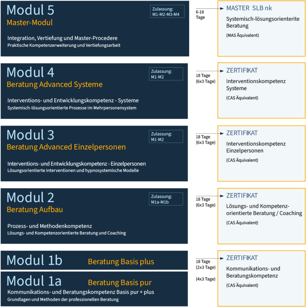 In fünf Kompetenz-Modulen gelangen Sie von den Grundlagen in systemisch-lösungsorientierter Beratung bis zum Master-Abschluss. Jedes Modul entspricht im Umfang einem CAS. Mit dem fünften Modul kann ein Master Abschluss erworben werden.